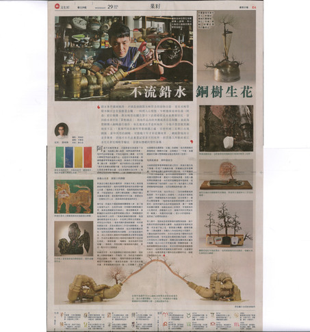 阿森是位樂於嘗試的藝術家,試過在木板上重現電路板的精密設計,後來他發覺電路板的紋理像中國山水畫。「電路板上有很多電線,電線與電路板有關係,不想直接拆走,就將它變成銅樹。」傳統中國山水畫講求意境,當他覺得畫面有所欠缺,便嘗試加一些微型公仔上去,孤翁垂釣的意境油然而生。 兩年前,阿森在中環嘉圖畫廊籌備個人展,除了展出裝置作品外,也希望加插一些移動的銅樹點綴空間,最後他將銅樹安於插頭上,變成移動風景。喜歡攝影的他閒時也會帶着銅樹去散步,將銅樹置於後巷的喉管上拍照。「我做的銅樹很像枯樹,我想讓枯樹看起來有生命力,於是將它帶到自然環境,看看是否有幫助。」後巷周圍的環境較潮濕,時常看到銅綠出現,於是他嘗試在工作室向銅樹噴水,發現竟慢慢長出銅綠,枯樹逢春,他自然顯得驚喜若狂。他利用從淘寶網買來的銅喉,自行組裝裝置作品,再以火槍熔化錫條來焊接銅喉與水喉管的接駁位,作品的金屬基座則以電路板的錫粒聚少成多熔化而成。一個煤氣爐、一塊鐵板,組成他創作用的熔爐;一個基座,背後是數十塊電路板的錫粒,要花一整天功夫才能做成。 熔錫是苦差,每天他最樂此不疲的指定動作,是給牆上的銅樹噴鹹水,早晚各一次,為的是令銅絲快些長出銅綠。不僅牆上,連廁所插頭也掛着銅樹,難道不怕觸電嗎?「裏面沒有線路,我只是放在廁所裏,看看銅綠會否長快一點。」打開櫃子,原來也隱藏着長滿銅綠「花瓣」的銅樹。他亦將銅樹的銅絲捲成一圈圈的花瓣,定期噴水,一年後,長滿銅綠的花瓣令整棵銅樹有點似梵高的《星夜》。